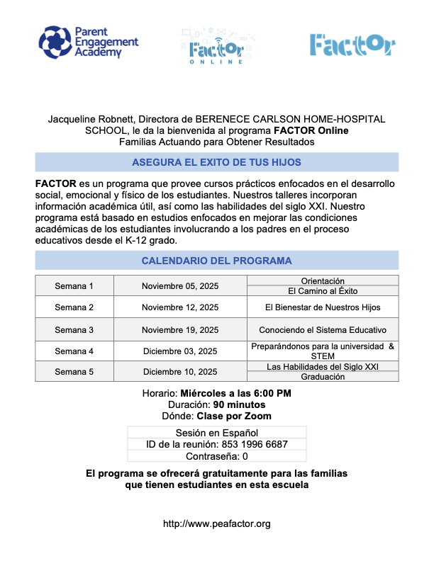 Parent Engagement Academy ENGLISH/ VIRIDIANA MORAN https://us02web.zoom.us/j/87925954989?pwd=cJkDyIHTdCZxfbolOvjrJpuqkFqVLI.1 Meeting ID: 879 2595 4989 Passcode: 0 SPANISH/ YOLANDA SORIA https://us02web.zoom.us/j/85319966687?pwd=4ddMbmB17kYGBDjmYrOTqHeadpXjE6.1 ID de reunión: 853 1996 6687Código de acceso: 0 Attached Files PrincipalsCalendar- Carlson Hospital.pdf